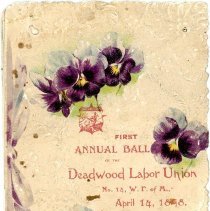 Dance card for the First Annual Ball of the Deadwood Labor Union No. 14, Western Federation of Miners (W. F. of M.) on April 14, 1898. The front of the card is decorated with purple flowers. The inside has a piece of paper with a list of 23 dances. The card is blank. The back of the card lists the committee.